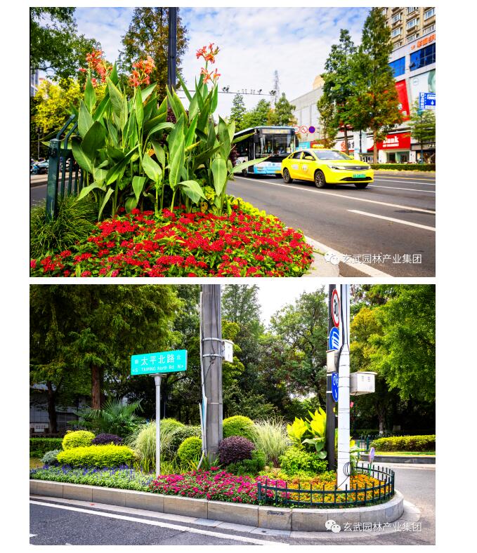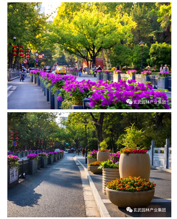 對北京東路、珠江路、市府門前路、太平北路、玄武大道、龍蟠路等綠島及島頭花境選用一品紅、萬壽菊、三角梅、洋鳳仙、麗格海棠、矮牽牛、歐月、藍雪花、超級海棠、翠蘆莉、一串紅、孔雀草、石竹等靚麗多彩、品相精致的花卉進行布置,城市街景處處繁花似錦、百花齊放,營造栩栩如生、欣欣向榮的景觀效果。